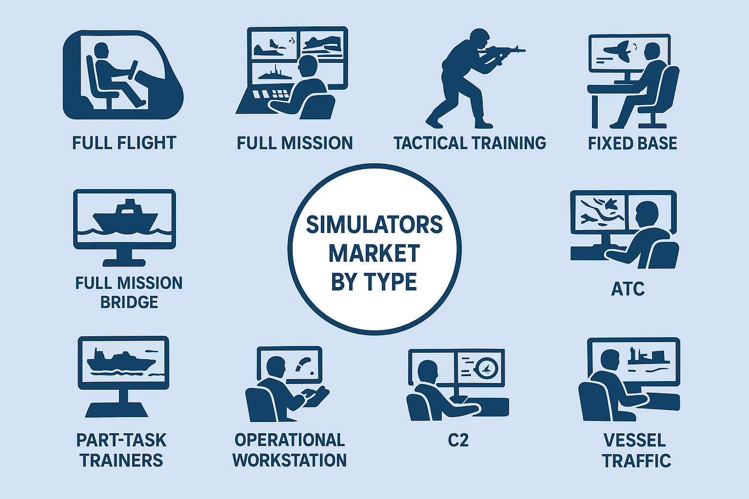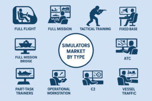 As global industries face increasingly complex challenges, the reliance on simulators is growing rapidly. Airlines need highly trained pilots for new generation aircraft, defense organizations demand realistic combat preparation, and maritime operators require skilled navigators for safe vessel handling. Simulation technology offers these stakeholders a safe, cost effective, and immersive environment to enhance competencies without exposing assets or personnel to risk. This blog explores the simulators market by type, including full flight simulators, full mission systems, tactical training devices, fixed base simulators, full mission bridge simulators, part task trainers, operational workstation simulators, C2 systems, ATC simulators, and vessel traffic control systems.
