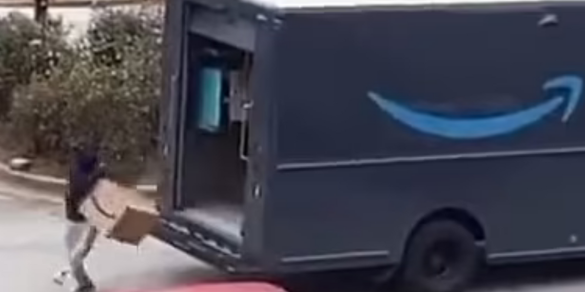 One of the group raiding the ground falls to the ground as he rounds the corner of the truck but quickly gets back up and grabs a large brown Amazon box.
