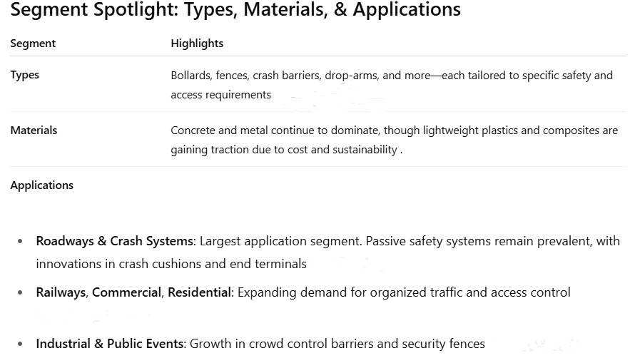 – The market is transitioning toward smart barrier systems integrated with sensors, IoT, and remote monitoring tools
