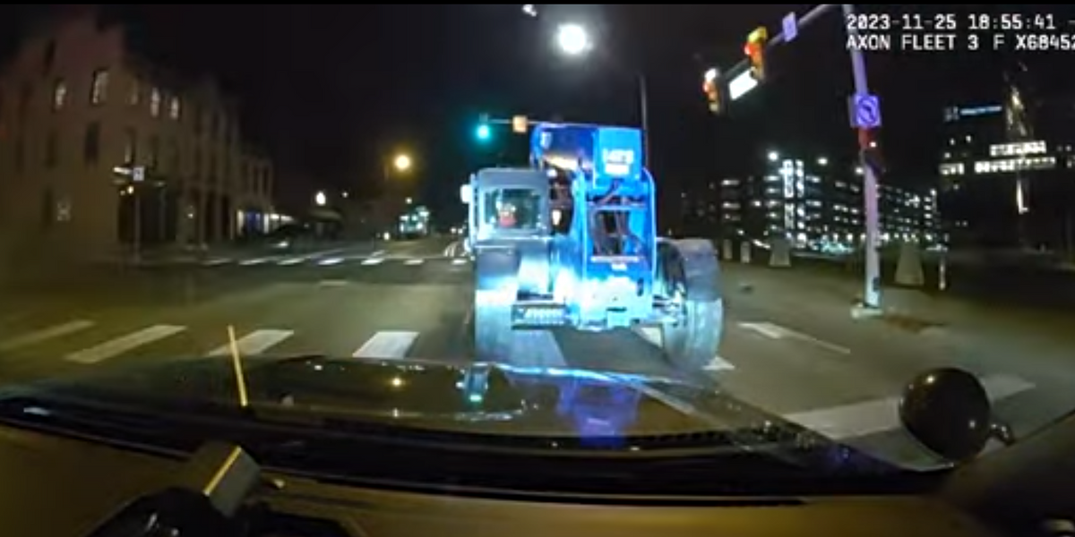Driving the Construction Genie GTH-636 Telehandler, the boy was followed by police in an hour-long pursuit, with the 12-year-old hitting 10 parked cars during the chase.
