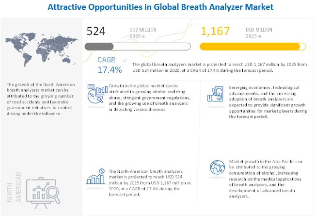 According to the new market research report “Breath Analyzer Market by Technology (Fuel Cell, Semicoductor Oxide Sensor, Others), End User (Law Enforcement Agencies, Enterprises, Individuals ), Application, Region (North America, Europe, APAC, RoW) – Global Forecast to 2025″, published by MarketsandMarkets™, the breathalyzers market is expected to reach USD 1,167 million by 2025 from USD 524 million in 2020, at a CAGR of 17.4% during the forecast period.