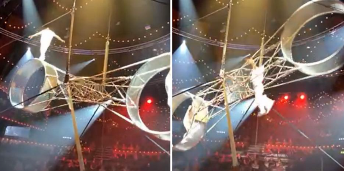 The acrobat, who is in his 20s, fell at least 10 metres, as he collided with metal scaffolding then hit the ground.
