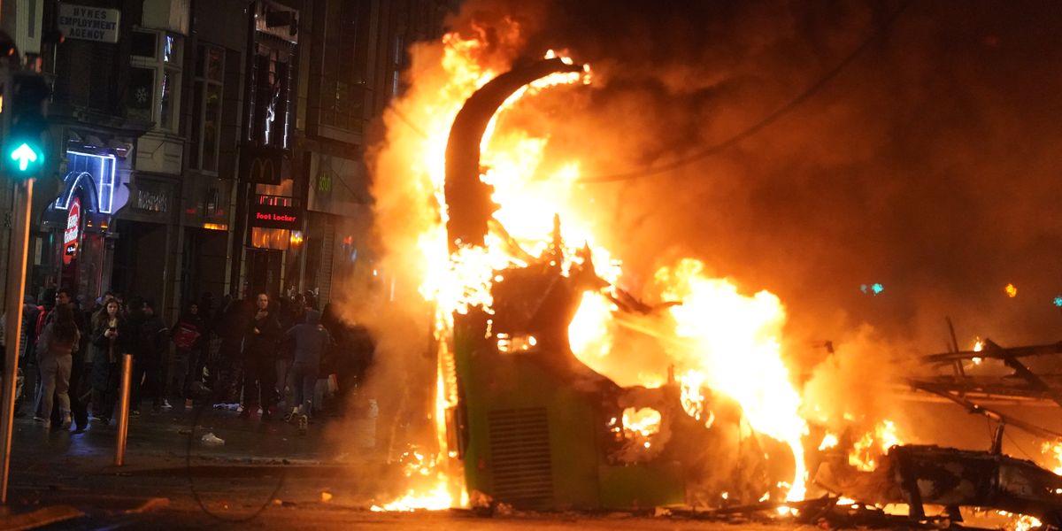 Buses and trams have been set alight in Dublin after riots erupted following a knife attack which left a woman and three young children injured.
