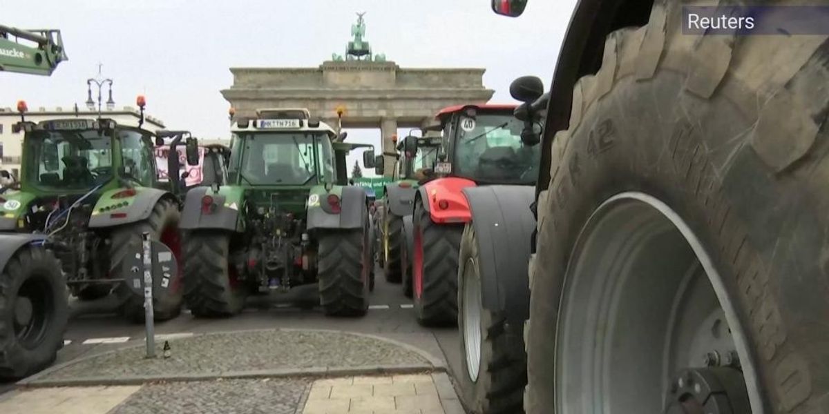 German farmers have gathered in Berlin around the Brandenburg Gate to protest against planned cuts to tax breaks for diesel used in agriculture – part of a deal reached by the government to plug a hole in the country’s budget.