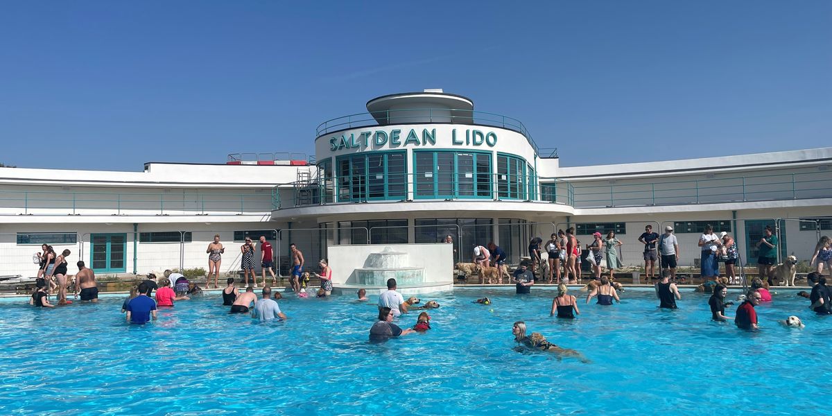 Dogs and people swimming in Saltdean Lido