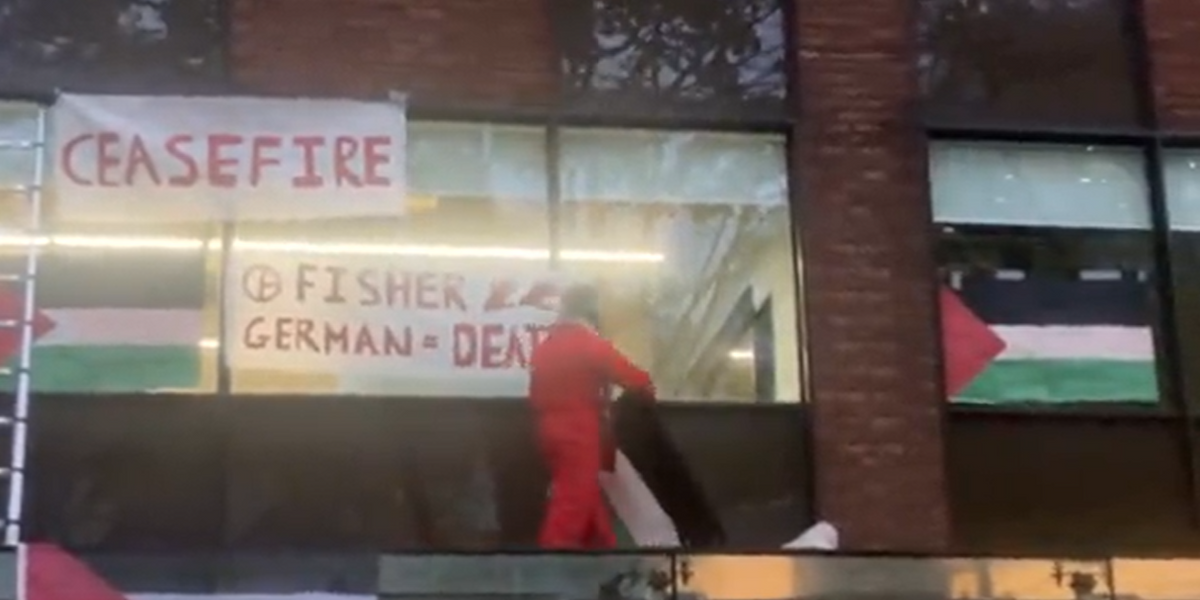 In the video posted on the groups page on X, formerly Twitter, the group said: “BREAKING: An actionist is on top of Fisher German Manchester.