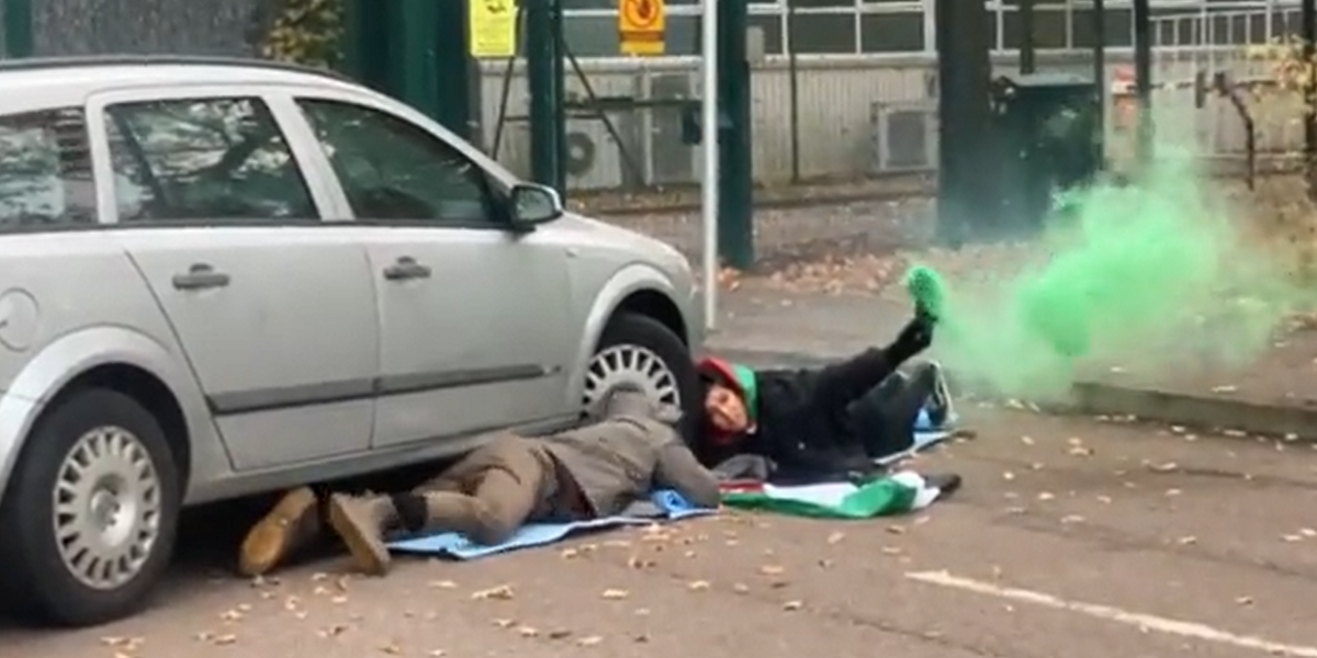 Protesters also laid down in the road in Leicester preventing workers from accessing Elbit System.