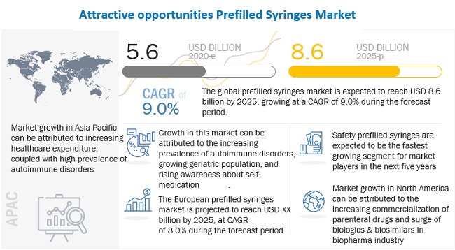 According to the new market research report “Prefilled Syringes Market by Type [Conventional (Disposable, Reusable), Safety], Material (Glass, Plastic), Design (Single-Chamber, Dual-Chamber, Customized), Application (Diabetes, Cancer, Arthritis, Anaphylaxis, Ophthalmology) – Global Forecast to 2025″, published by MarketsandMarkets™, is estimated to be USD 5.6 billion in 2020 and projected to reach USD 8.6 billion by 2025, at a CAGR of 9.0%.