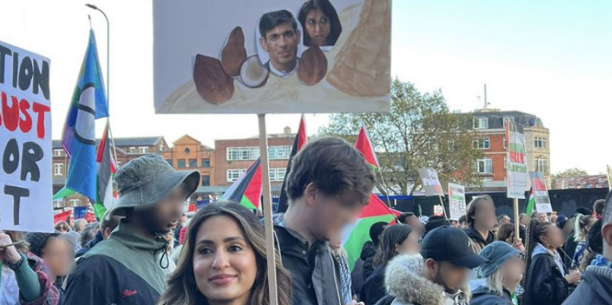 A pro-Palestine marcher who wielded a sign depicting Rishi Sunak and Suella Braverman as coconuts has been revealed to be a teacher.