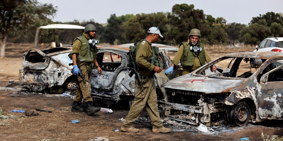 Israeli soldiers clean debris and personal items left behind at the site of the surprise attack launched by Hamas